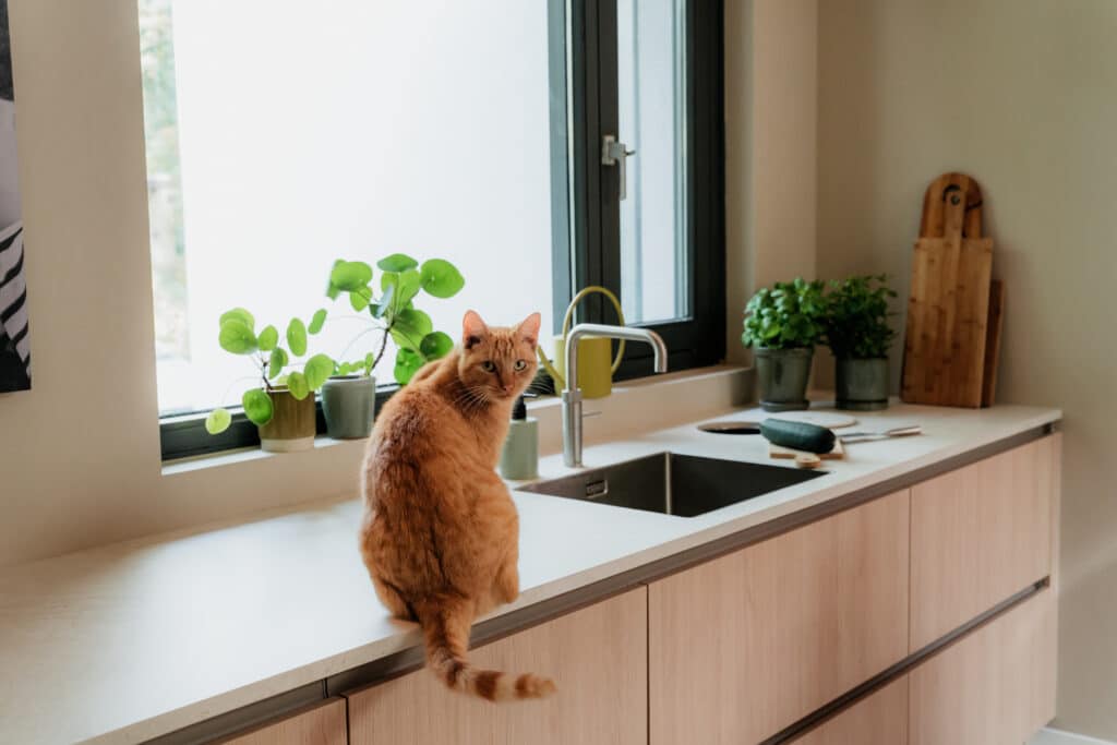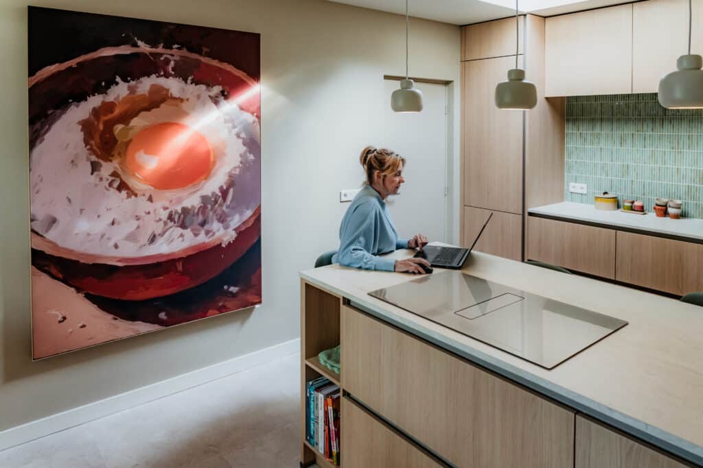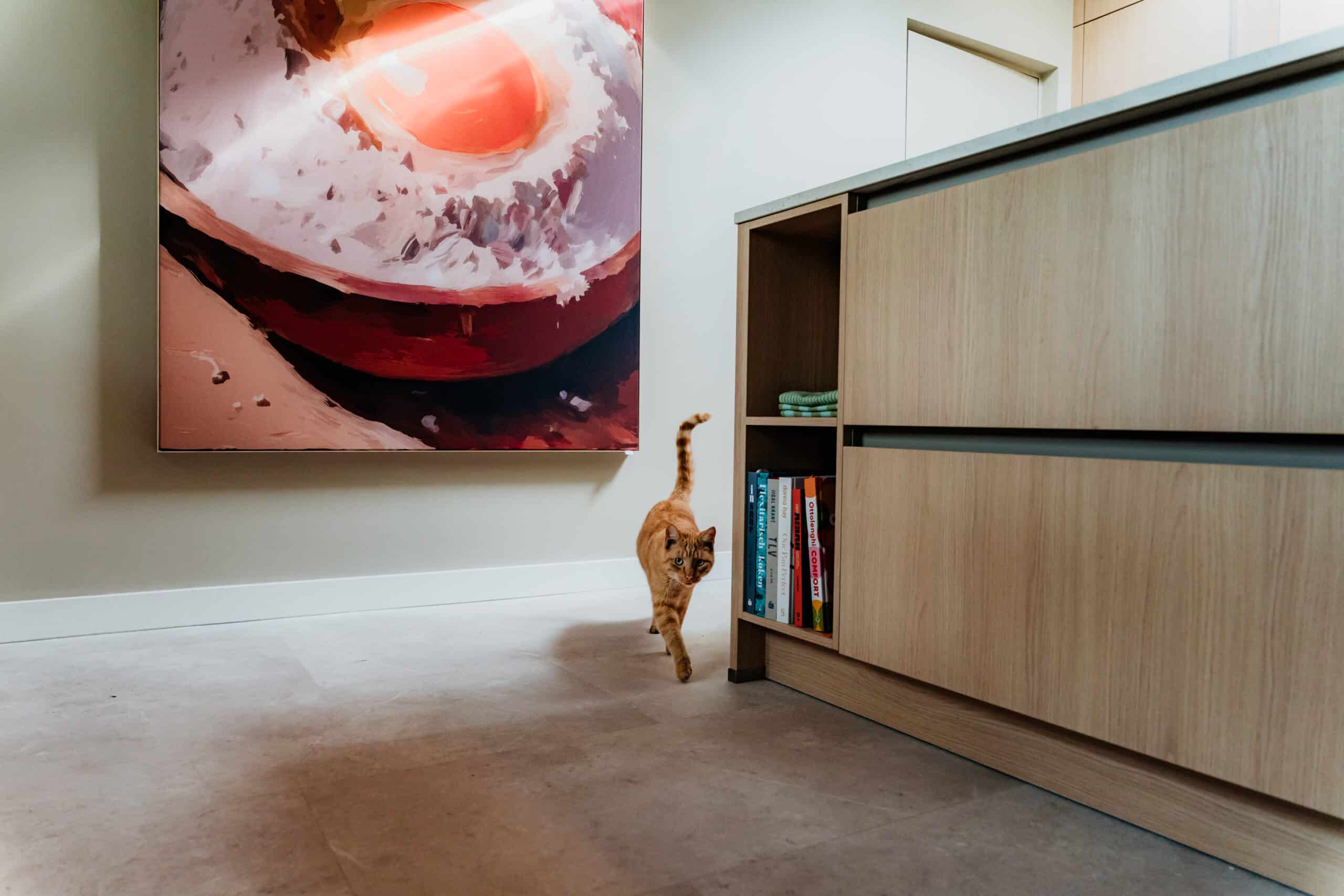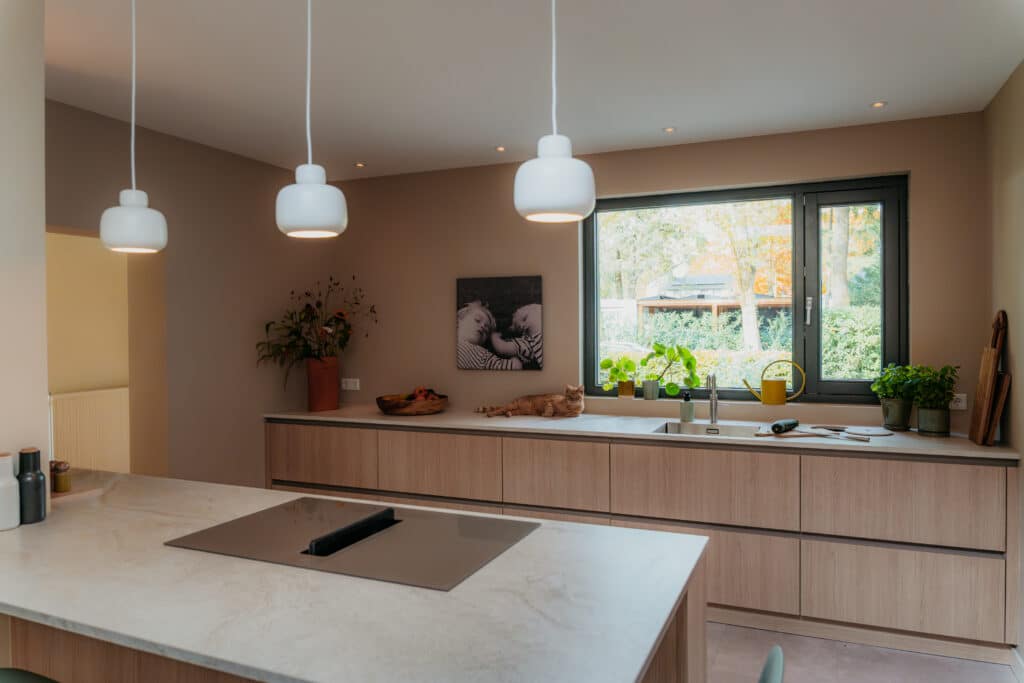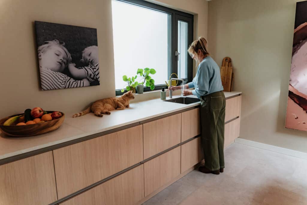 Het resultaat is een stijlvolle leefkeuken waar gewerkt, gekookt en geleefd wordt. Elk element, van maatwerk kasten tot slimme opbergoplossingen, is ontworpen met oog voor detail en gebruiksgemak. Zelfs de huisdieren voelen zich hier helemaal thuis.