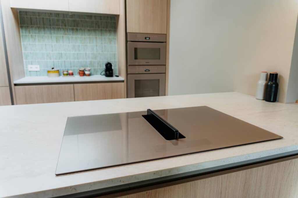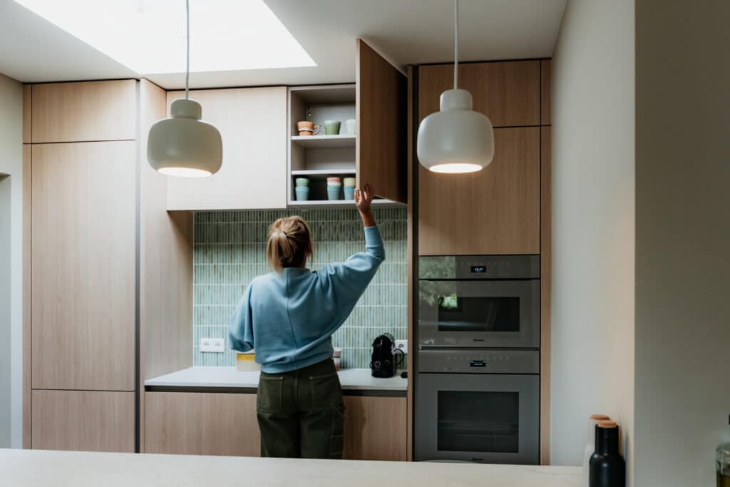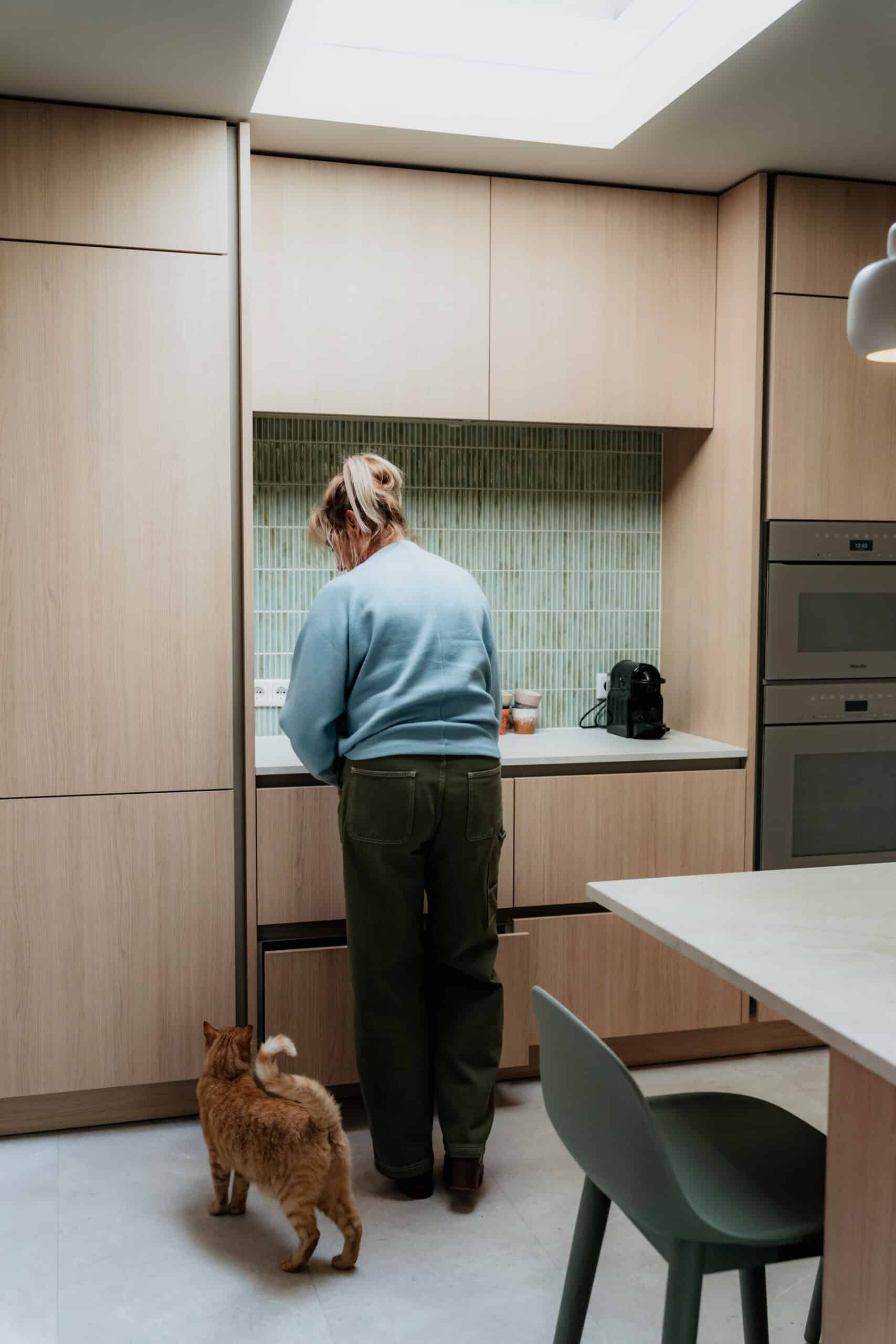 Alles klopt in deze keuken van familie de Waal. Van de rustige houtlook kasten tot de blauw-groene tegeltjes in de koffiehoek, elk detail is zorgvuldig op elkaar afgestemd. De champagnekleurige Miele-apparatuur voegt een luxe touch toe, terwijl het geïntegreerde prullenbakje in het werkblad en de ‘onzichtbare vaatwasser’ de keuken praktisch en overzichtelijk houden.